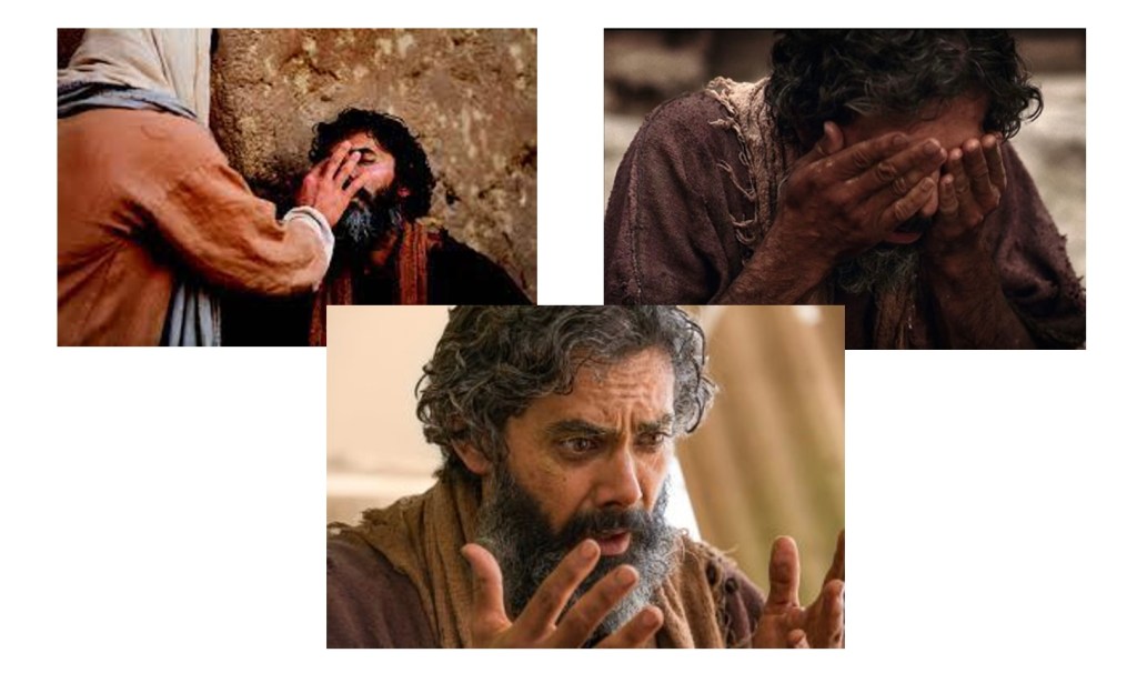 As he walks with his disciples from the temple precincts where he was nearly stoned to death, Jesus comes across the man who had been born blind. The Jews firmly believed that anyone born with an affliction inherited that affliction as punishment for parental sins or even the pre-birth sin of the afflicted one. (They subscribed to a complicated theological doctrine that held one could sin before birth.) The man asks Jesus to cure him. He has some understanding that Jesus has been healing people and he knows Jesus is special as evidenced in addressing him as Rabbi. The story develops like a narrative of conversion and baptism and finally commitment to Jesus. Let’s examine how each of these takes place.