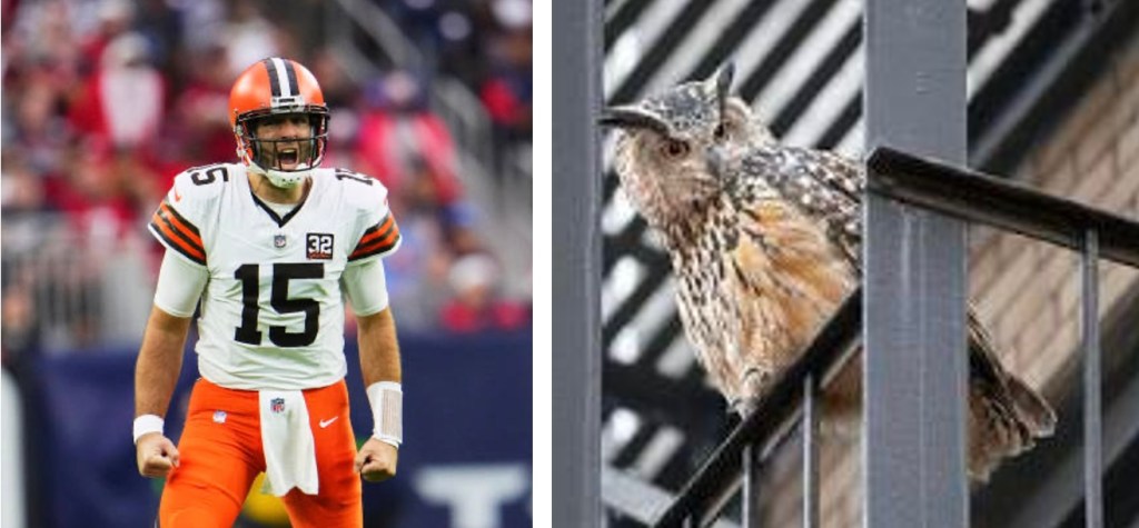 The spelling of the other Flacco’s name is with one ‘c;’ he was Flaco, the Eurasian Eagle Owl who died last month in New York City after hitting a Manhattan high rise. Flaco had escaped from the Bronx Zoo after vandals had ripped the fence enclosure that housed him since 2010. He had been on the run, or flight shall we say, for one year and three months. He was one month from his 14th birthday. Eurasian Owls have the largest wingspan of the bird kingdom, a full six feet. They thrive in mountains and are apex predators, among the largest in the world. They are also beautiful. Flaco attracted photographers from all over New York. Tri-pods cluttered sidewalks just to get pictures of the handsome bird with an auburn-colored chest, and white and black-feathered wings. Residents would report his whereabouts whenever they spotted him on some perch, preferably the top levels of fire escapes or the roofs of high-rise buildings. He even had a favorite tree in Central Park! People watched him like Clevelanders watched Flacco with two ‘c’s. And, like that Flacco, he had a stealth to him, a strategy, a wary eye on possible danger. And when he flew, he flew silently into the end zone and turned around victoriously on the perch proud of his achievement.